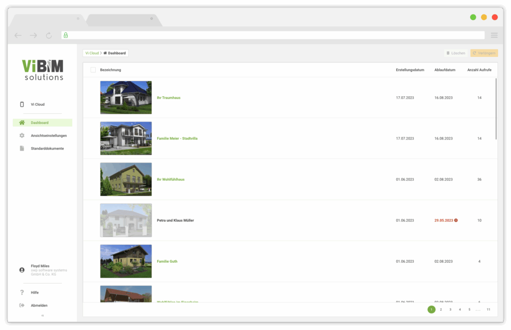 Auf dem Dashboard finden Sie eine Übersicht der aktuell veröffentlichten Vi Cloud Hauspräsentationen Ihrer Firma, die Sie dort bei Bedarf auch verlängern oder löschen können.