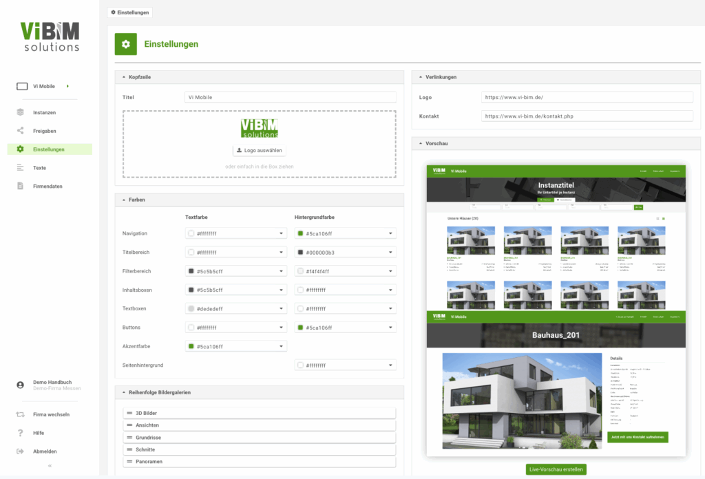 Unterhalb der integrierten Vorschau-Ansicht haben Sie zusätzlich die Möglichkeit, alle Design Einstellungen anhand einer Live-Vorschau von Vi Mobile mit Demo-Häusern zu testen und bei Bedarf nochmal anzupassen, bevor Sie die Änderungen veröffentlichen. Klicken Sie dazu einfach auf den Button Live-Vorschau.