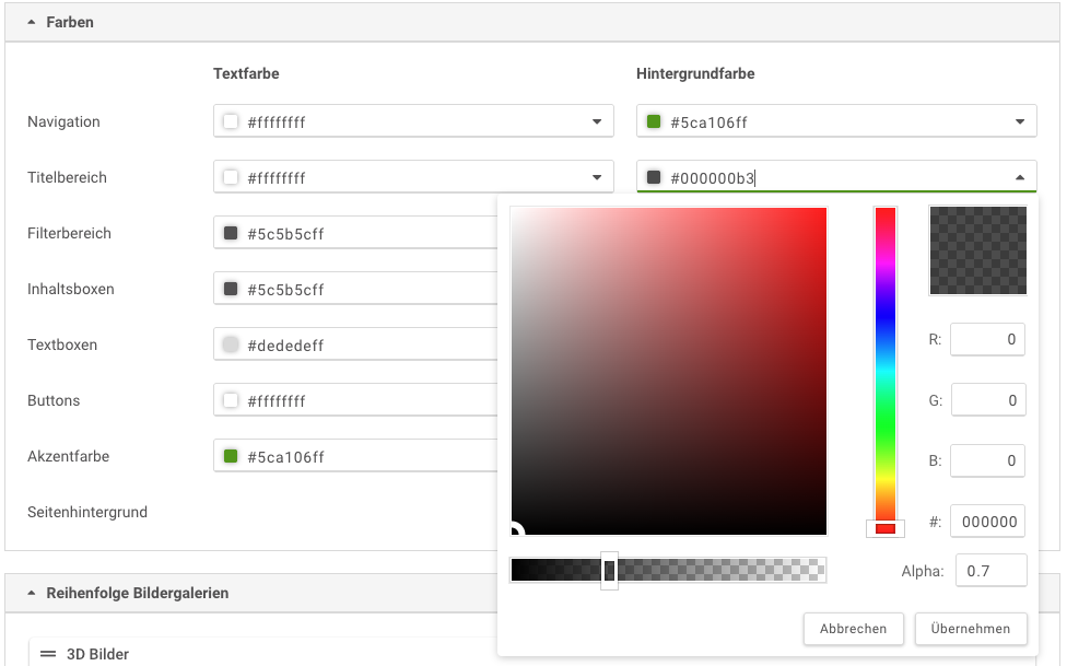Farbwerte können auch mit Transparenz definiert werden (Alpha-Kanal), was eine präzisere Anpassung Ihrer Firmenfarben ermöglicht.