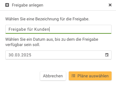 Wählen Sie die Pläne für die Freigabe aus. Dazu nutzen Sie den Button Pläne auswählen.